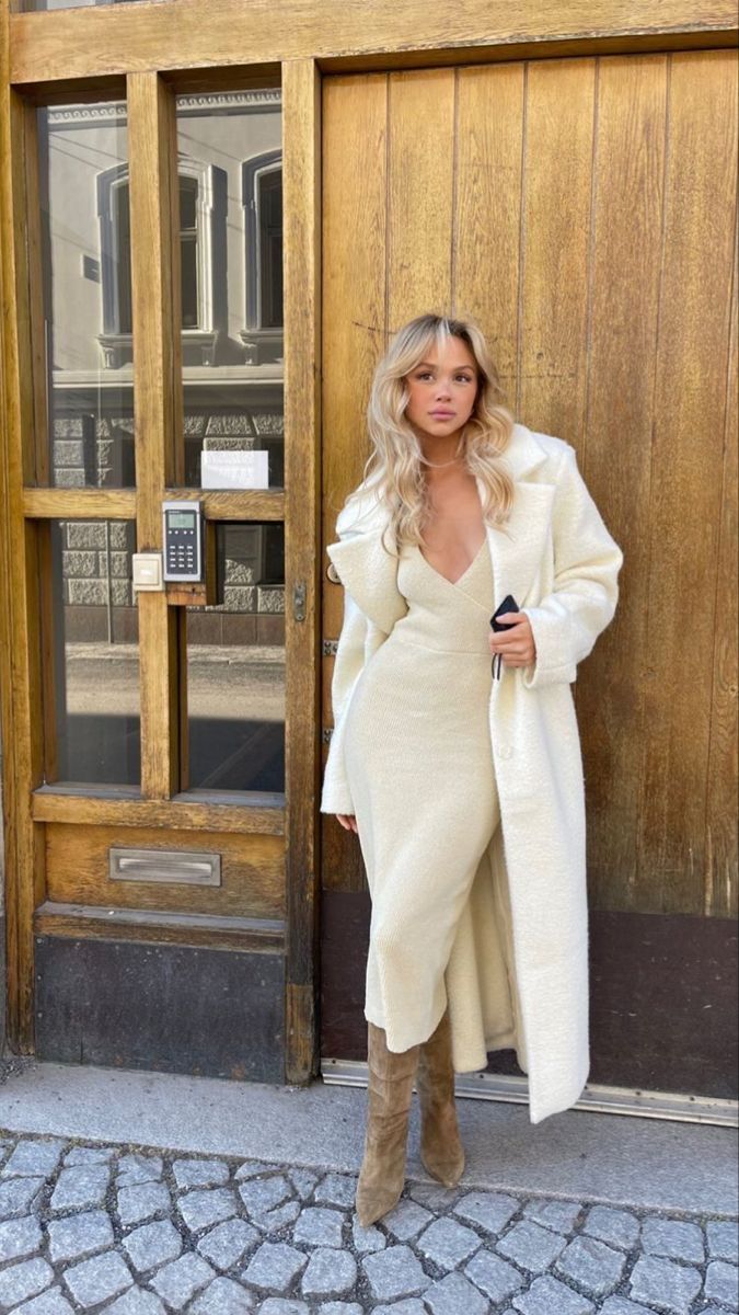 This textured cream dress paired with soft suede boots is one of those “quiet luxury in real life” moments. The V-neck, soft knit texture, and warm tones make the look ideal for late winter into early spring, especially for daytime outings. The midi length and subtle flare are flattering on most figures, particularly pear and hourglass shapes. The long cream coat layered on top gives everything a taller, softer line.