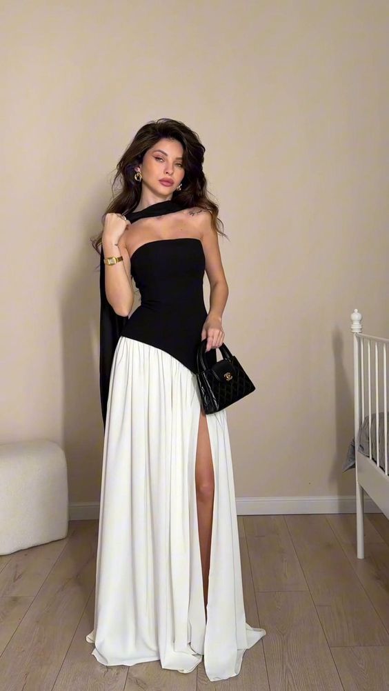This two-tone gown—black on top, flowing white chiffon below—brings bold architectural character. The asymmetrical neckline and thigh-high slit feel modern yet wearable, a perfect example of design that honors motion and curve. Great for medium to tall figures, it elongates the body beautifully. It plays well for semi-formal soirées, creative events, or fashion-forward dinners; it’s too dramatic for office wear but flawless for a special night out.