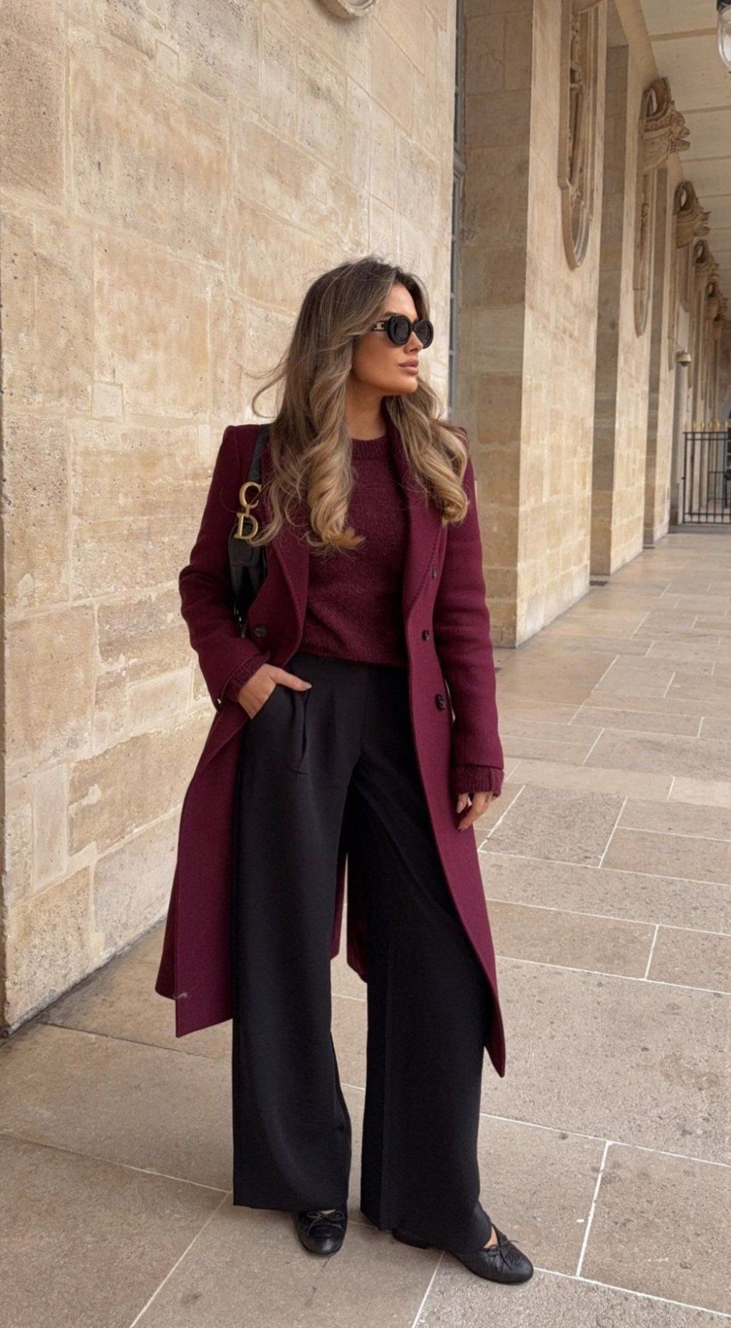 A masterclass in urban elegance, this outfit mixes deep wine tones with rich textures for a look that feels both luxe and weather-ready. The tailored burgundy coat offers that perfect weight for rainy autumn afternoons when it’s too cold for light layers, but not quite parka season. The structured silhouette flatters most body shapes, especially hourglass and rectangle figures. For pear shapes, the flared trousers and hip-length cut may feel a bit overwhelming without the right proportions. This is a look that would thrive in a work office business casual setting or an upscale gallery stroll—but maybe skip it on a full-blown storm day unless you’ve got a cab waiting.