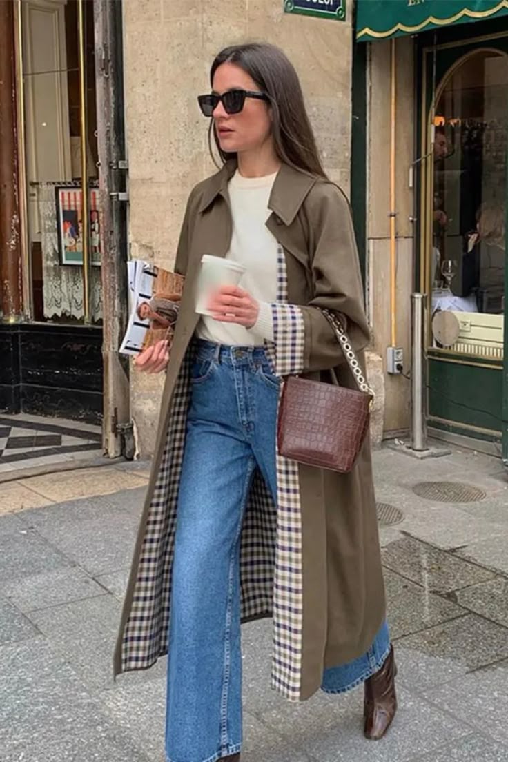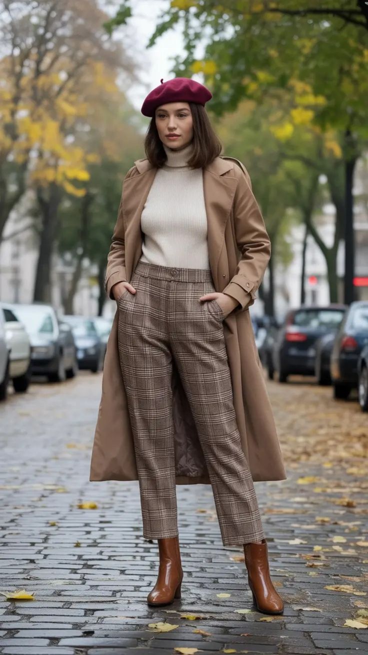 A little rain never stopped a good beret. This look is giving romantic, cinematic aesthetic with a nod to vintage charm. From the flowing trench to the tailored plaid pants, everything feels thoughtfully curated, yet approachable. It’s ideal for crisp city walks, coffee dates, or even gallery afternoons. Perfect for most body types, though the structured pants will flatter straighter figures best.