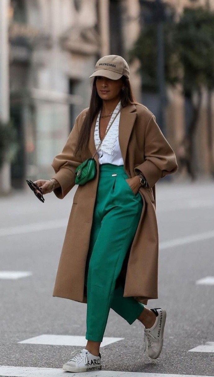 This outfit says, “Yes, I’m running errands—but make it luxury.” Equal parts trendy, functional, and playful, the camel coat and Balenciaga cap make the look street-ready, while the bright green trousers keep it from feeling too serious. Ideal for a tall or long-legged frame, this silhouette plays with proportion in the best way. Think morning commute, brunch with friends, or heading into a creative office on a misty day.