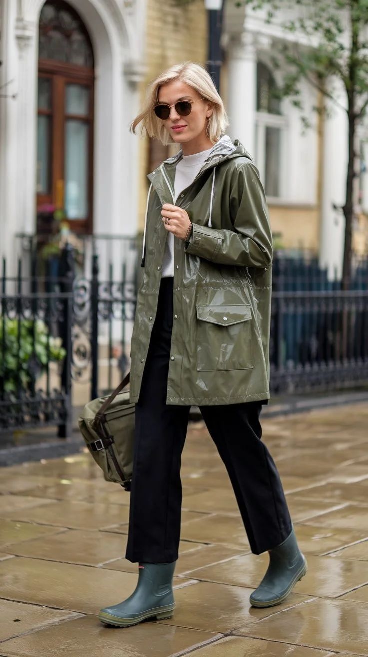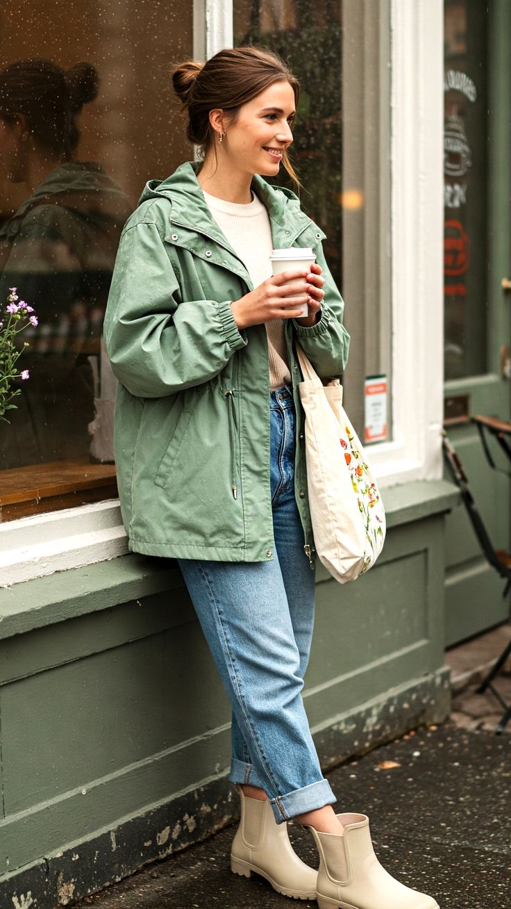 Sometimes, casual is the new cool—and this look is living proof. Relaxed, cheerful, and perfect for grabbing a chai on a drizzly afternoon, this is exactly what to wear when you want to look cute but not overthink it. The sage green rain jacket has soft edges and looks great on petite to medium builds, especially when paired with straight denim. This is an all-day, all-weather look for errands, meet-ups, or just cozy window-seat writing sessions.