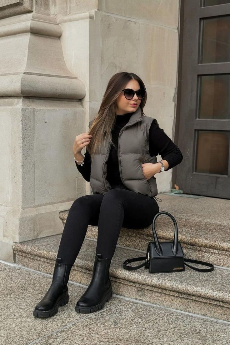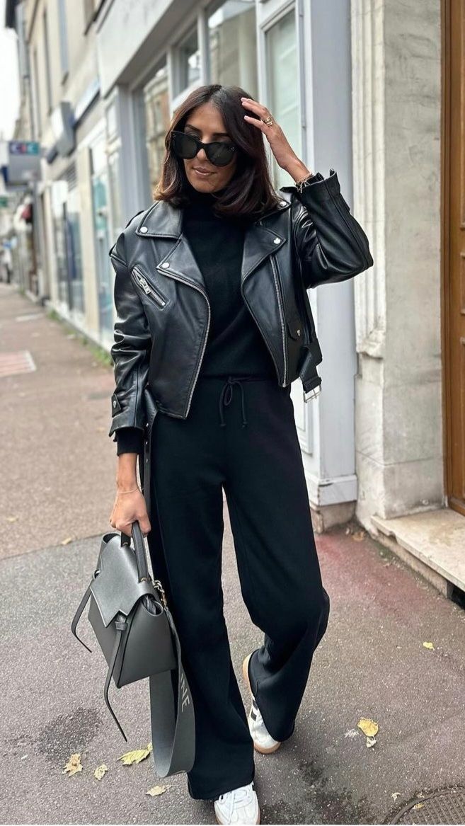 This all-black ensemble screams confidence with a whisper of rebellion. A cropped leather biker jacket over slouchy black pants? Yes, please. And it’s not just style—this look offers warmth, rain resistance, and cool-factor all in one. Ideal for apple or rectangle body types thanks to the defined shoulders and loose pants. It’s a go-to for work, coffee runs, or just strutting with a bit of quiet attitude on wet pavement. Very trendy, very now.