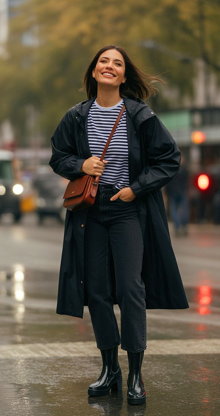 Classic with a splash of coastal cool, this outfit is everything London streetwear wants to be on a wet Wednesday morning. The striped tee and straight-leg jeans offer that easy casual vibe, while the navy raincoat adds functionality without overpowering the look. What’s genius here is how adaptable the silhouette is: it flatters most body types thanks to the high-rise denim and the long coat line. Practical for errand runs, casual workdays, or dashing across campus—this is prime inspo for school or even light travel.