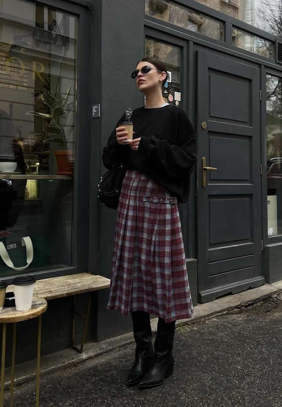 Burgundy plaid midi skirt: Soft punk meets vintage charm