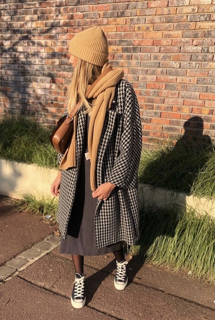 The houndstooth coat here is the hero—it’s giving old-money aesthetic, but the sneakers and scarf combo bring it back down to earth. This look is fabulous for transitional weather when you need warmth, but the rain has passed. Great for hourglass and athletic builds. Could easily be Inspo for school or a casual city stroll.