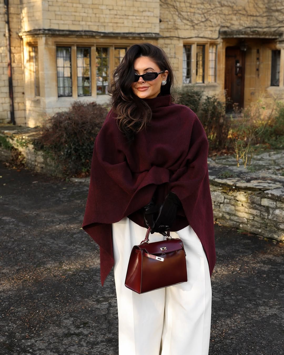 This ensemble turns dreary days into elegant statements. The rich bordeaux wrap drapes beautifully, forming a soft, structured silhouette that’s perfect for layering without feeling bulky. The voluminous nature of the poncho flatters curvy and tall frames but might overwhelm petite figures unless styled with something fitted underneath. This look works wonders for cold days where you still want to look refined—think countryside brunches, luxury boutique visits, or any outing where you want timeless polish over trendiness.