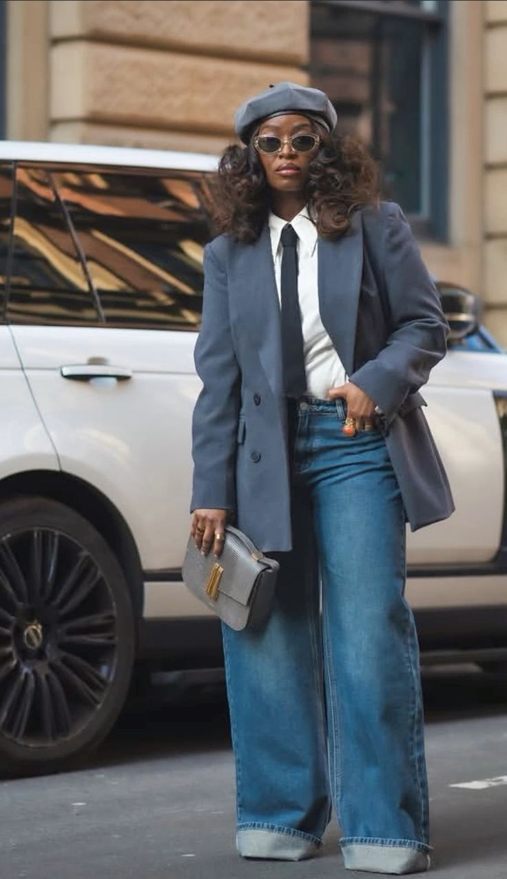Effortlessly fusing mens-inspired tailoring with street-savvy edge, this outfit is a rainy day knockout. From the oversized blazer to the dramatic wide-leg jeans, this look is about balance—bold lines on top, structured denim on bottom. Best on medium-to-tall frames as the proportions rely on length and volume. Ideal for gallery hopping, work office business casual dress codes in creative industries, or just serving editorial vibes while getting coffee.