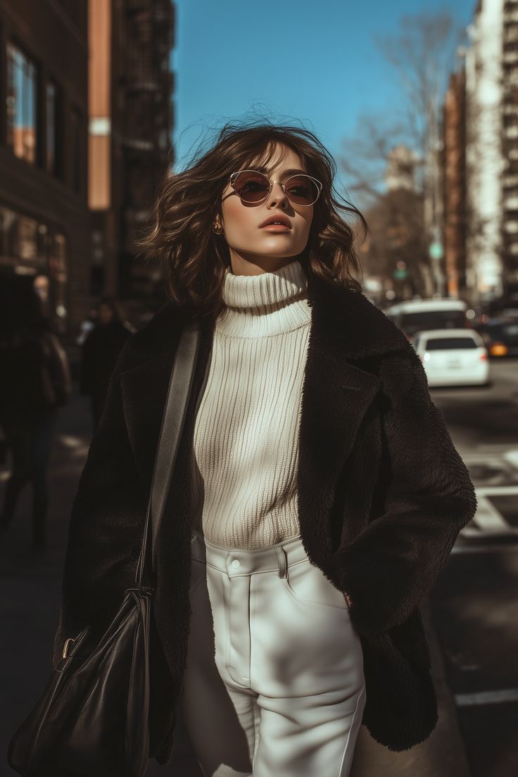 This look redefines rainy-day street style in 2025. The oversized faux-fur coat and creamy turtleneck create a luxe palette that feels both cozy and commanding. With the slightly boxy shape, this outfit works beautifully for most body types, though petite frames may want to opt for a slightly shorter coat to avoid being swallowed up. Perfect for downtown strolls or drinks with friends when the skies are grey but the fashion must still deliver.