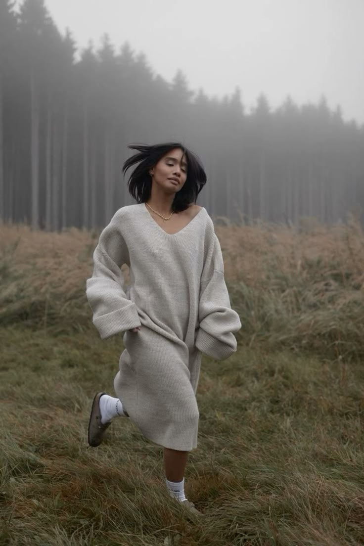 A vibe straight out of a Nordic fashion fairytale, this knit-dress look screams comfy while maintaining poetic simplicity. The exaggerated sleeves and relaxed cut make it ideal for apple or straight body shapes. While not exactly rain boots friendly, this look is perfect for post-rain moments in misty meadows, cozy rural escapes, or even intimate gatherings. It’s laid-back and effortless with a strong editorial mood.
