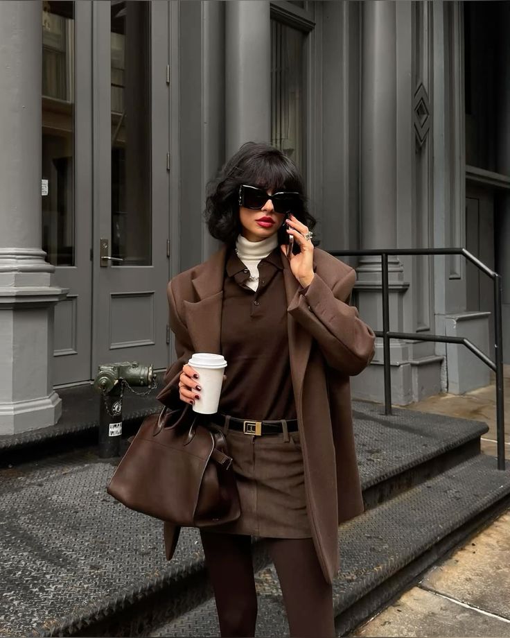 Brown is having its moment—and this look leans in with unapologetic monochrome magic. The structured blazer, mini skirt, and tights combo brings serious trendy energy. Best on hourglass and rectangle shapes due to the defined waist and clean leg line. Perfect for urban errand runs, coffee meetups, or just working in a cozy café corner while people-watching.