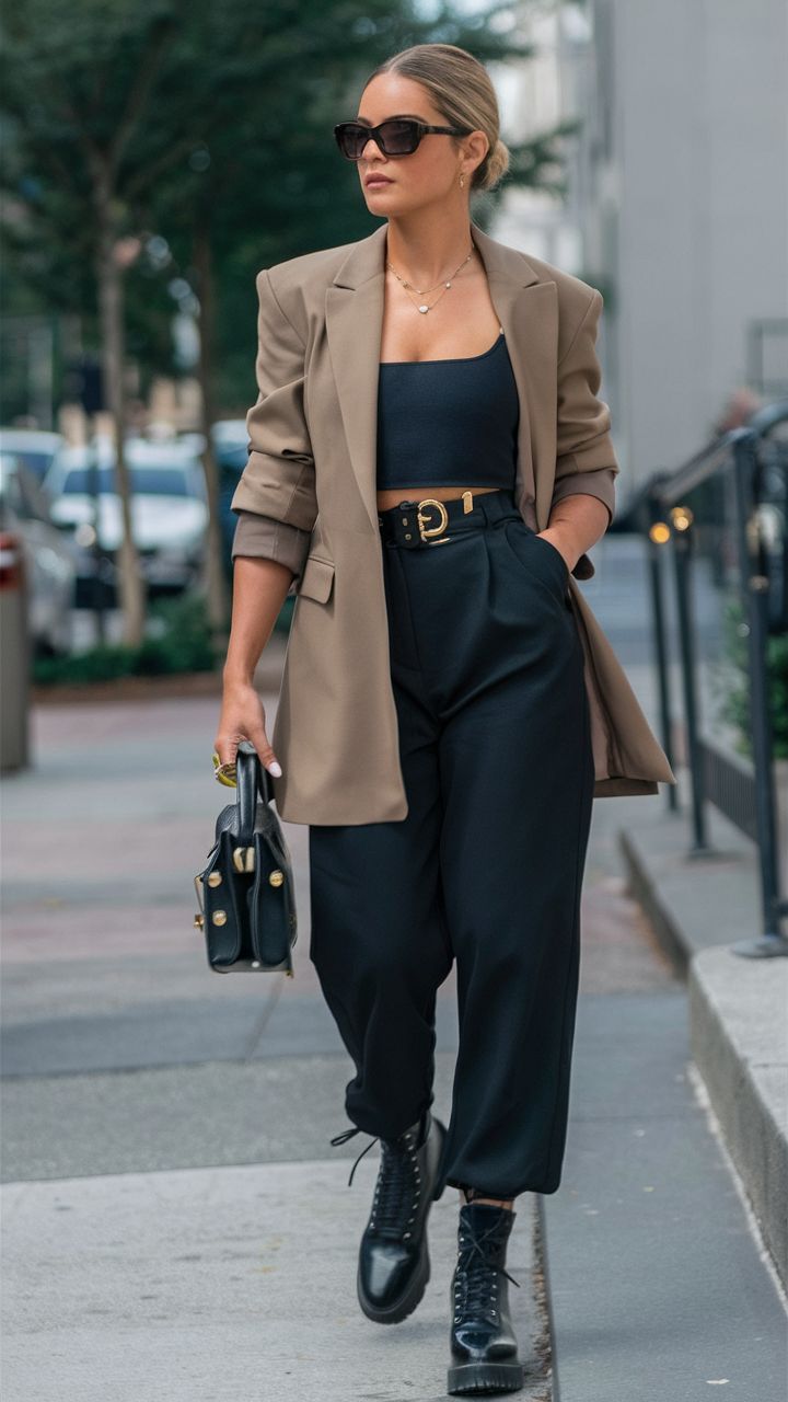 Here’s your work-to-drinks transitional outfit that defies weather gloom. With a tailored aesthetic and confident edge, this combo is ideal for fashion lovers who won’t let a little drizzle dull their shine. The high-waisted trousers with a defined belt enhance the waistline, which flatters most shapes—especially if you’re curvy or hourglass. However, for petite frames, the oversized blazer might need a little tailoring. This outfit says business casual with a side of don’t-mess-with-me energy.