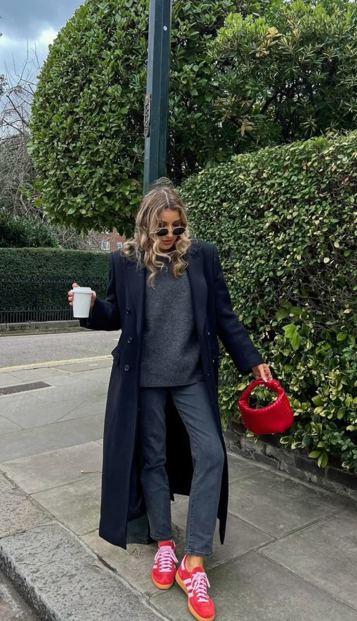 Red sneakers: Unexpected pop of color that brightens everything up.