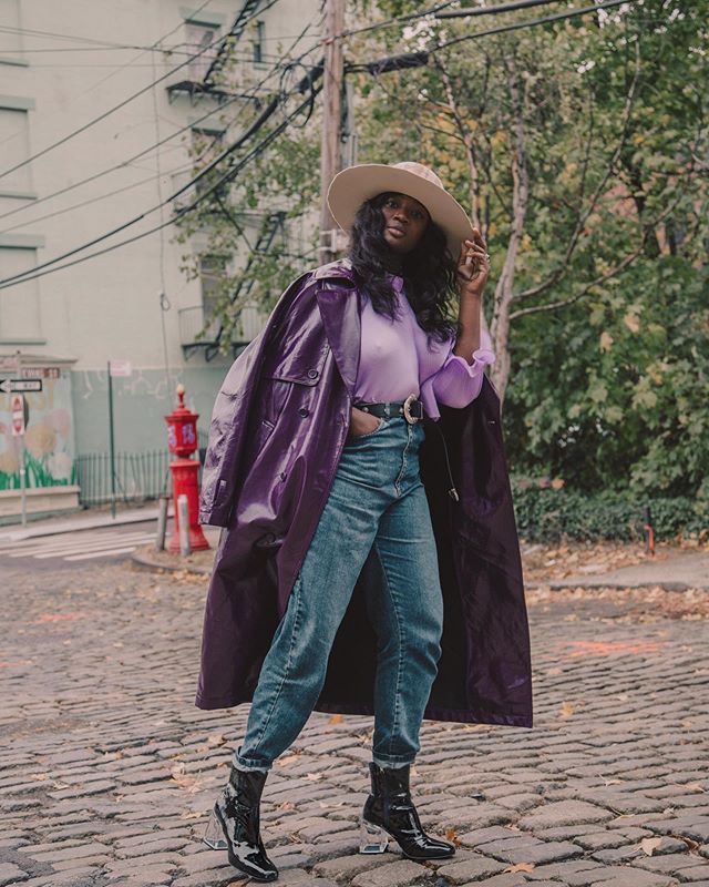 Drenched in color, this look redefines comfy and stylish dressing for the Spring 2025 cityscape. The vinyl purple trench is a statement all on its own—perfect for rectangle or column body types due to its unstructured drop. Not the best choice for petites unless belted tight at the waist. But make no mistake, this is a street-style dream. Best worn to creative meetups, fashion shows, or days when you want to be noticed and remembered.