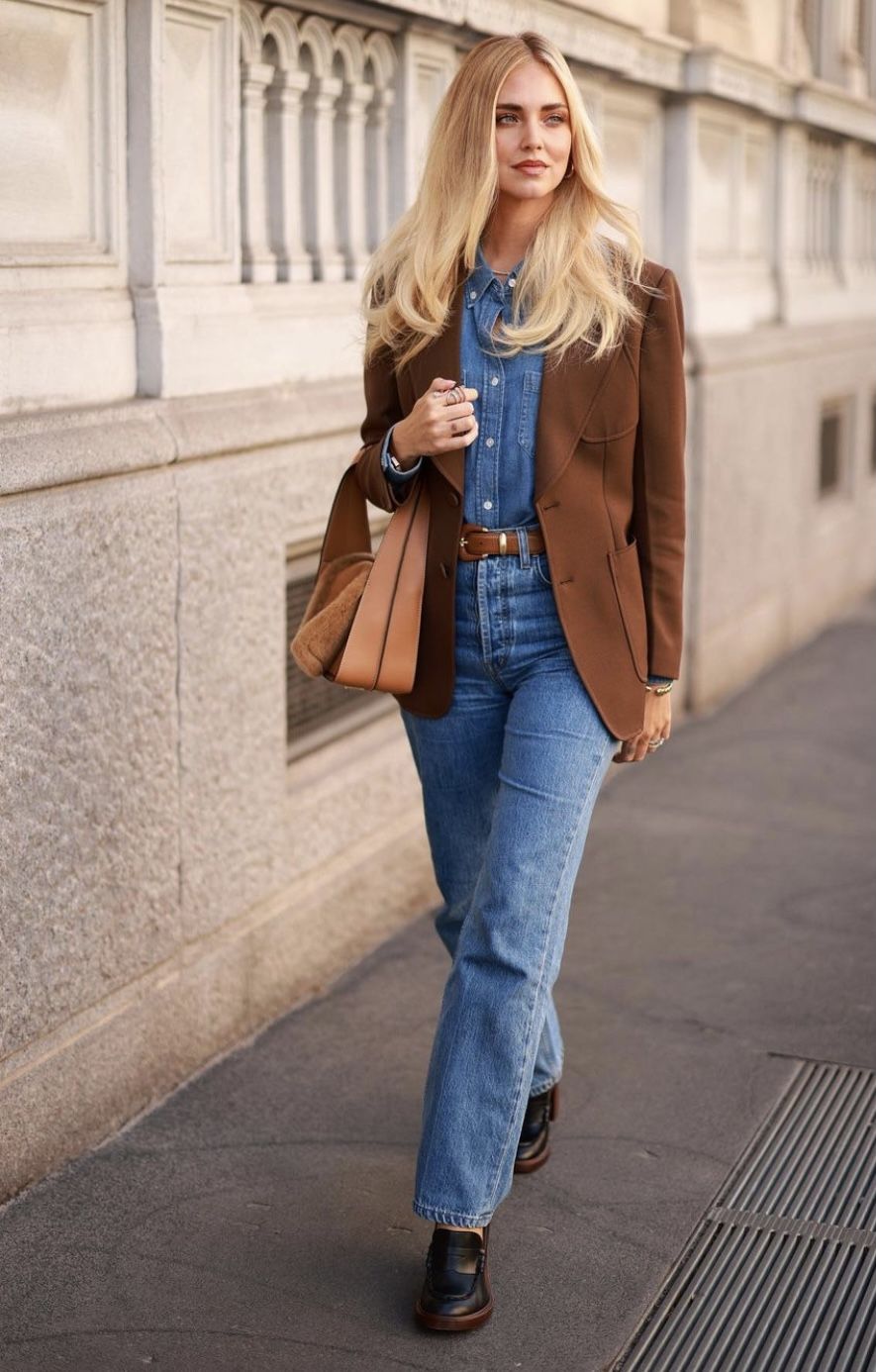 Classic denim-on-denim gets a polished upgrade thanks to a warm-toned, fitted blazer and sharp styling details. The look is balanced, thoughtful, and tailored in a way that works for both work meetings and smart casual outings. The outfit is incredibly flattering for straight and hourglass figures due to the structured waistline, but it could feel too stiff on petite frames unless carefully proportioned. With its clean silhouette and rich hues, this look transitions beautifully between cold and mild spring 2025 weather.