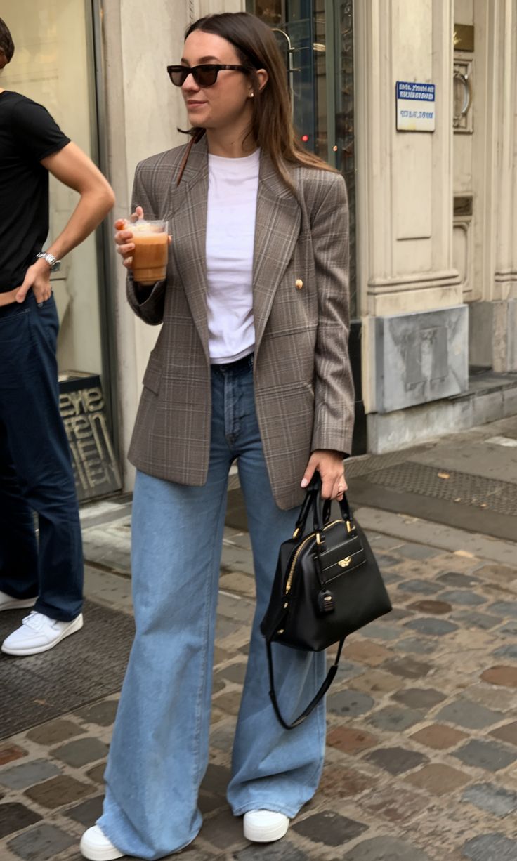 I’d skip heavy jewelry. The blazer already speaks. A simple tote or crossbody is enough — let the pattern do the work.