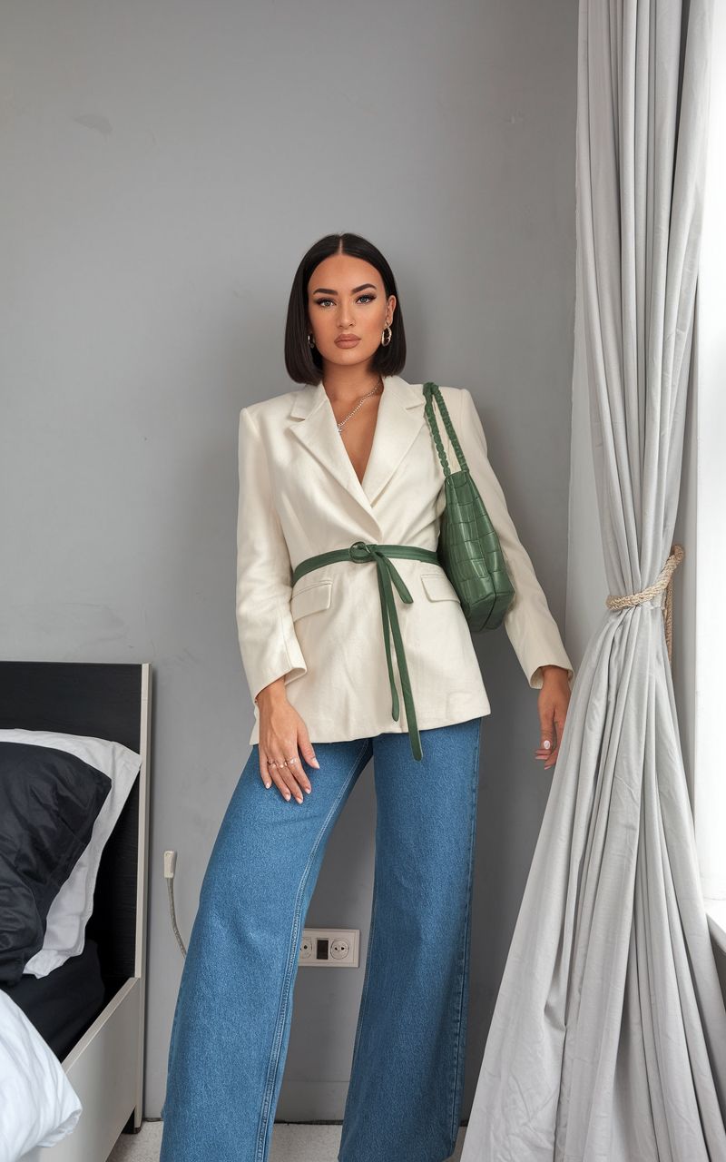 This look leans into refined femininity with a modern twist. The Cream blazer is softly tailored and cinched with a Green belt, creating shape without rigidity. Paired with wide-leg denim, it feels current, flattering, and versatile. Ideal for brunch, gallery visits, or polished daytime events—not quite boardroom, but definitely Dressy.