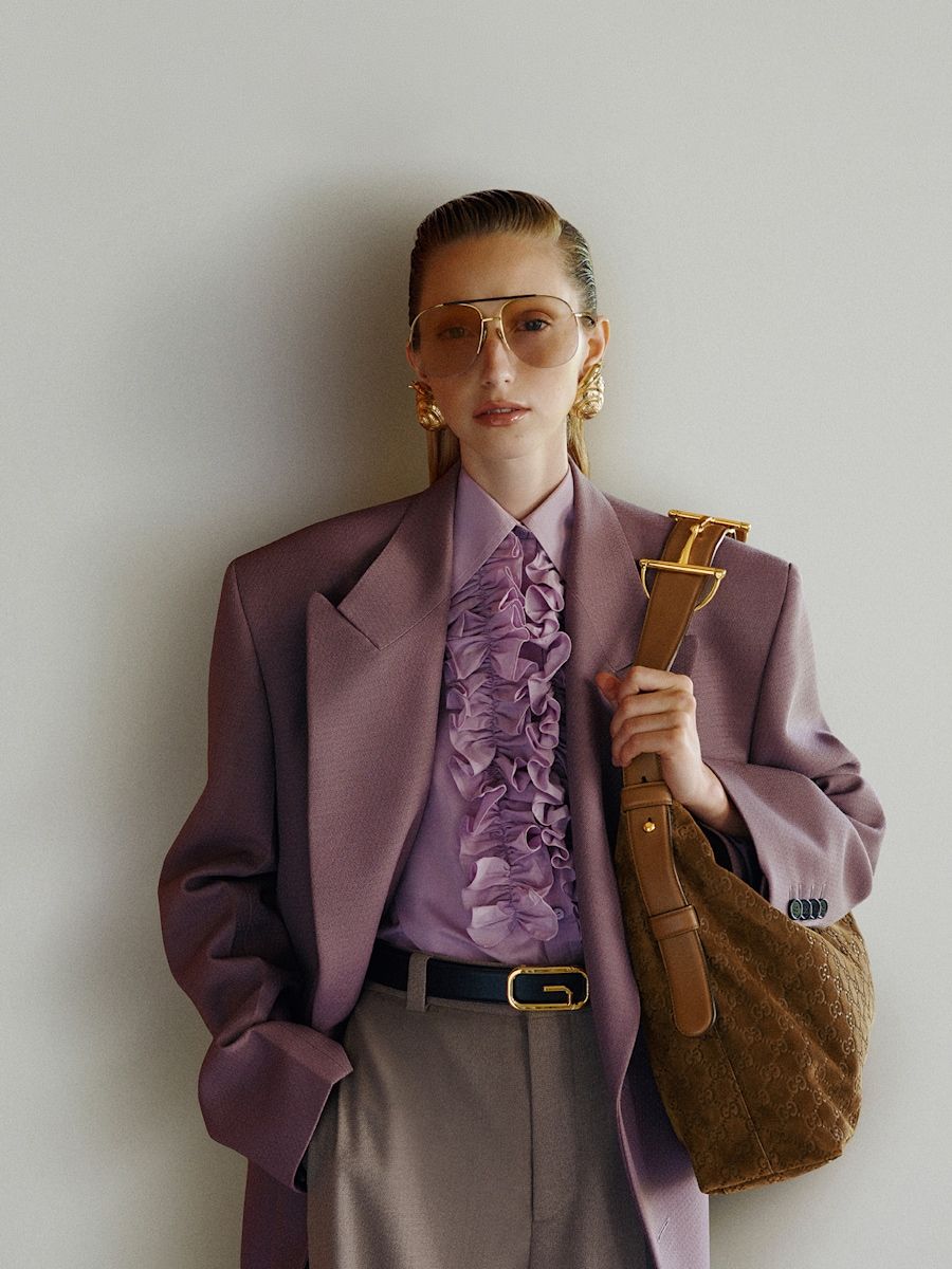 Soft tailoring meets romantic detail. The muted Pink-leaning mauve blazer paired with a ruffled blouse feels editorial yet wearable. It’s a strong Inspo look for creative professionals or anyone tired of standard neutrals. The straight trousers keep the look grounded.