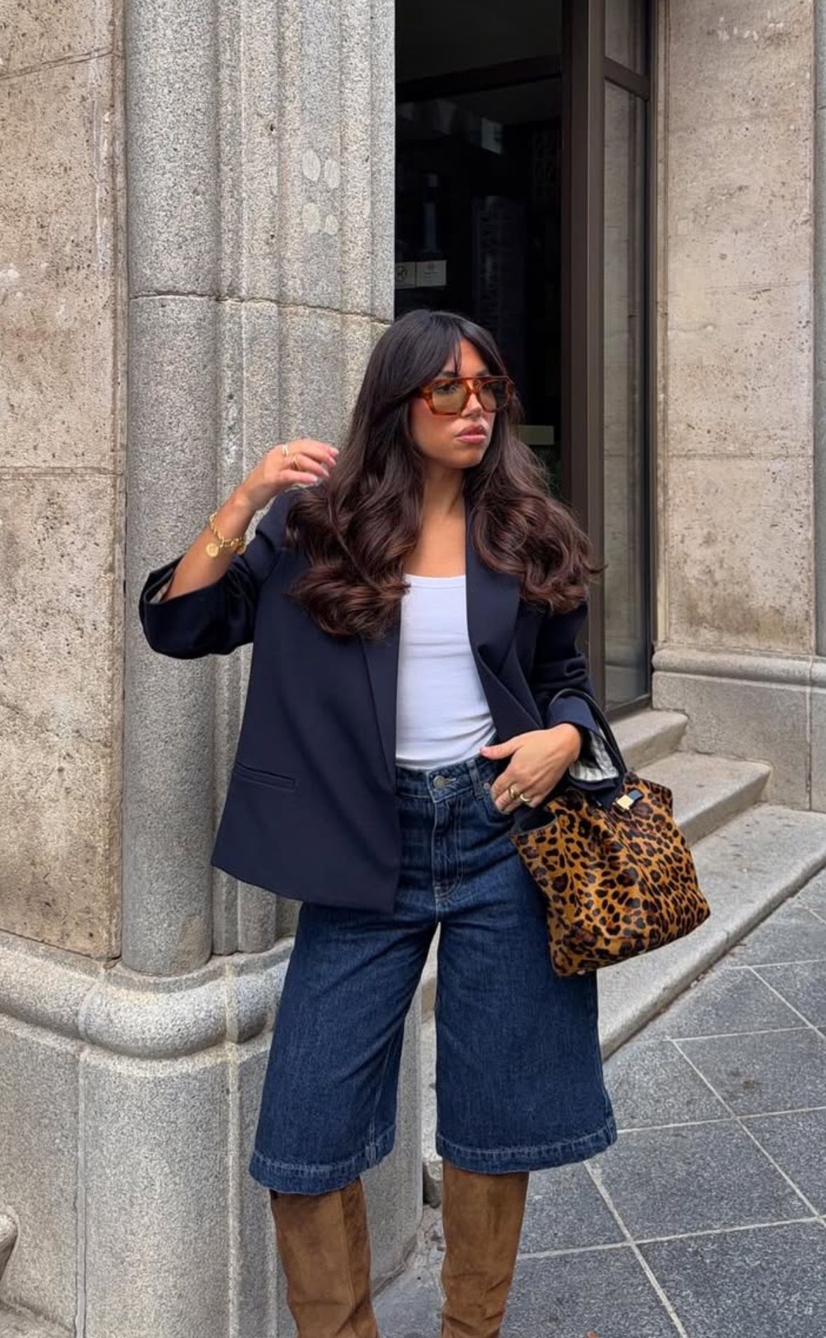 A Navy blue blazer instantly sharpens any outfit, and here it’s styled in a relaxed, street-ready way. The denim midi skirt and boots give it edge, making it ideal for transitional spring days. It’s practical, stylish, and works across age groups.