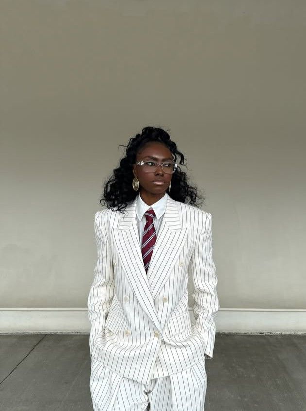 A crisp White pinstripe blazer paired with matching trousers instantly signals confidence, but the magic here lies in proportion. The slightly Oversized cut borrows from Mens tailoring while still respecting the body’s natural lines. This look works beautifully on tall or medium-height figures who want elongation; petite frames may need tailoring to avoid being overwhelmed. It’s ideal for Business casual offices, creative Work environments, and fashion-forward meetings—but it would feel too formal for laid-back weekend settings.