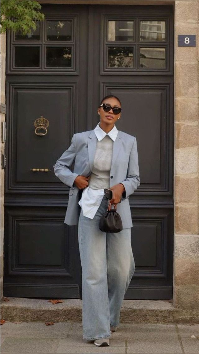 This look leans into a sharp, Cropped black blazer paired with high-waisted light blue Jeans and a fitted black top. The blazer’s gold buttons add subtle polish, while the shorter cut highlights the waist — ideal for straight or hourglass figures, but less forgiving on longer torsos unless balanced with higher-rise denim. It works beautifully for Casual outings, creative Work environments, and after-hours city plans, but feels too relaxed for conservative offices.