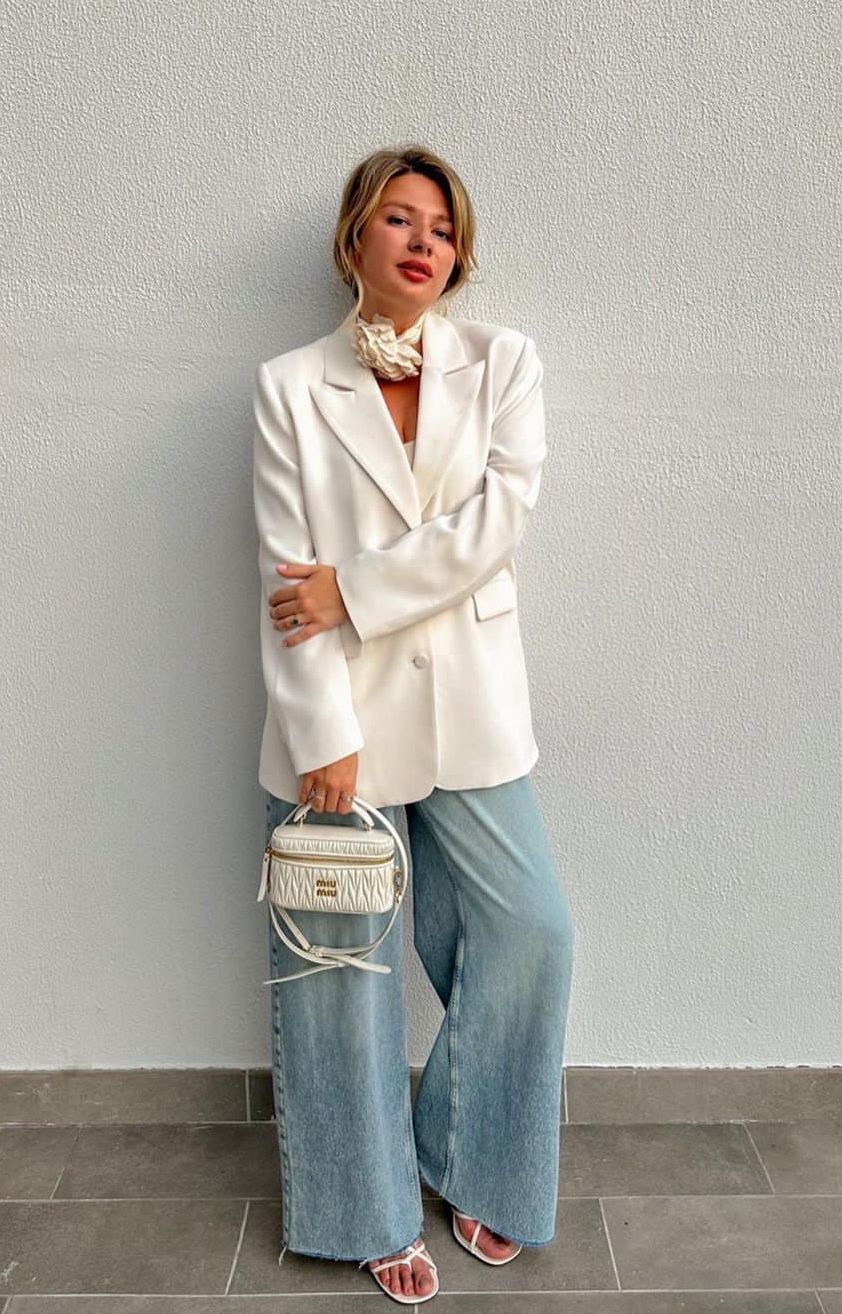 Cream Blazer with Wide Denim for Soft Feminine Balance