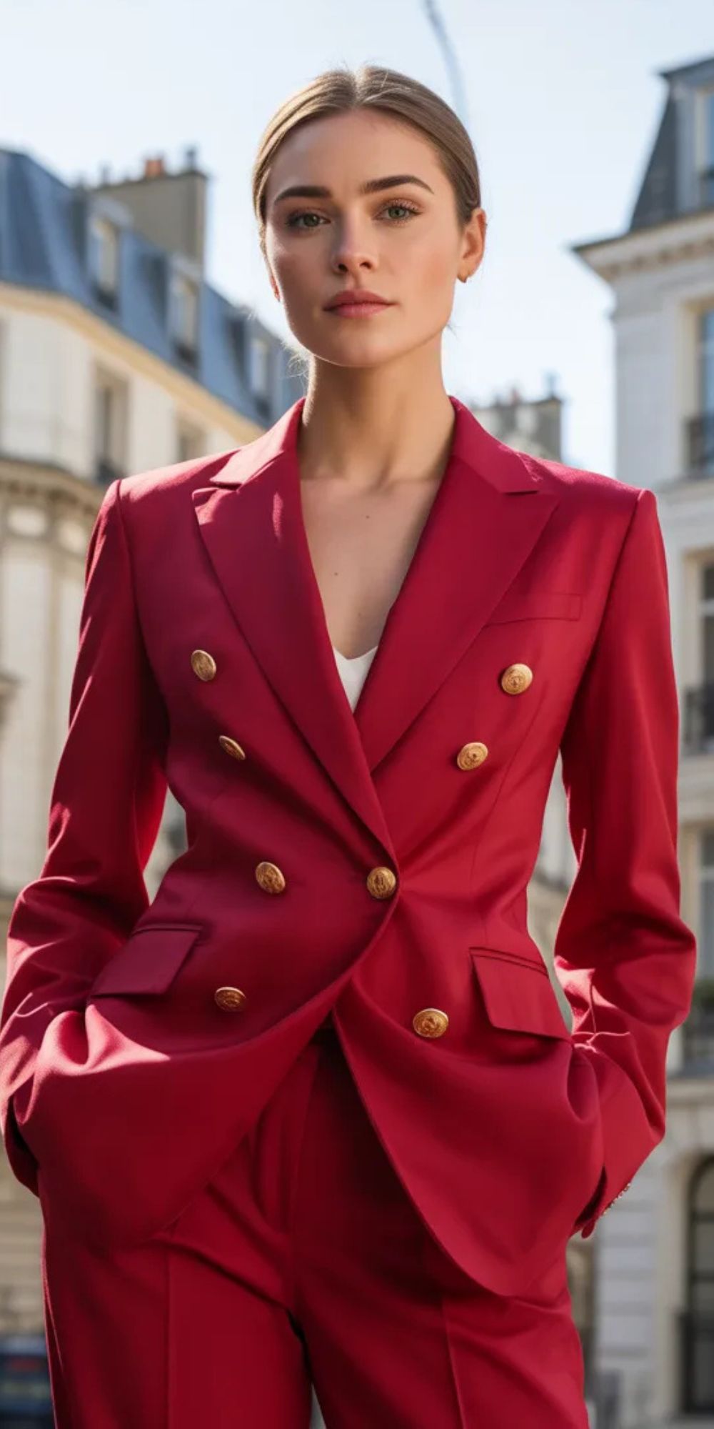 This Red blazer suit proves that bold doesn’t mean impractical. The tailored cut flatters hourglass and straight figures alike, while the color brings energy to spring wardrobes that usually default to beige. Ideal for fashion events, presentations, or confident Women in creative leadership roles—but too commanding for casual social settings.