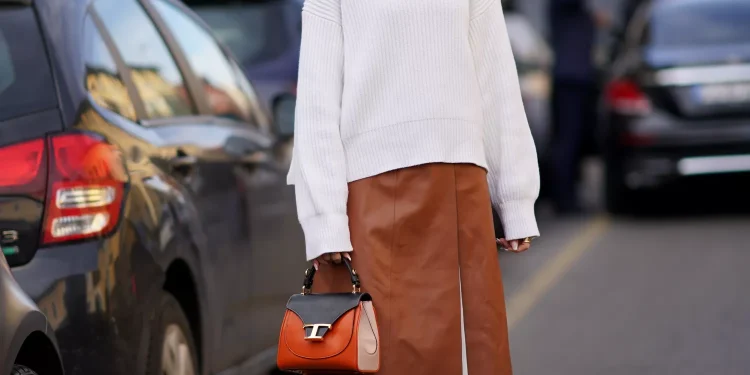 This ensemble captures the essence of urban sophistication with a fresh twist. The creamy white turtleneck paired with a caramel leather skirt feels both cozy and chic, perfect for transitioning into spring. The juxtaposition of textures and the pop of orange from the handbag add a playful touch.