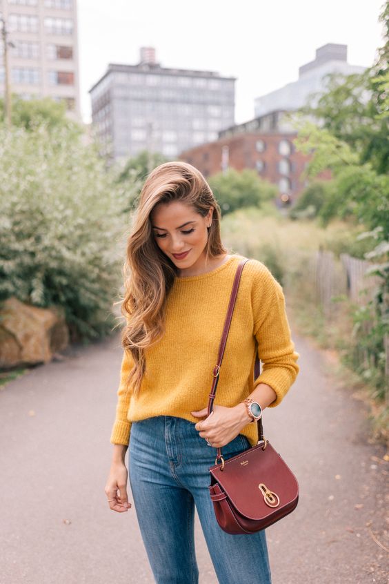 The mustard yellow sweater paired with classic blue jeans is a timeless look that’s both comfortable and chic. The rich hue of the sweater adds a pop of color that’s perfect for the fall season.