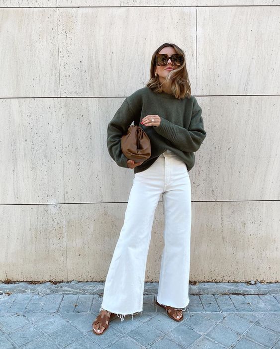 A dark green sweater paired with white wide-leg pants creates a minimalist yet sophisticated look that’s perfect for fall.