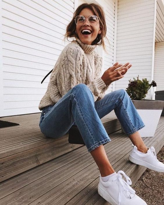 A beige cable-knit sweater paired with cropped jeans and white sneakers creates an effortlessly casual look that’s perfect for everyday wear.