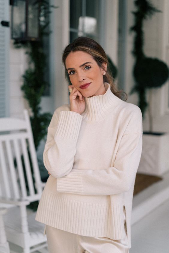 An all-white ensemble featuring a chunky sweater and matching pants creates a chic and cozy look that’s perfect for a minimalist fall wardrobe.