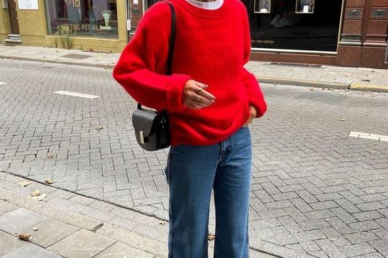 Turn heads with this vibrant red sweater and wide-leg jeans combo. This outfit is a bold statement that combines comfort with eye-catching style.