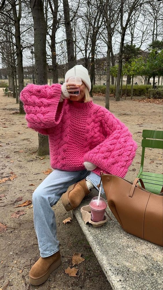 Brighten up your fall wardrobe with a playful pink chunky knit sweater and light jeans. This outfit exudes fun and youthful energy.