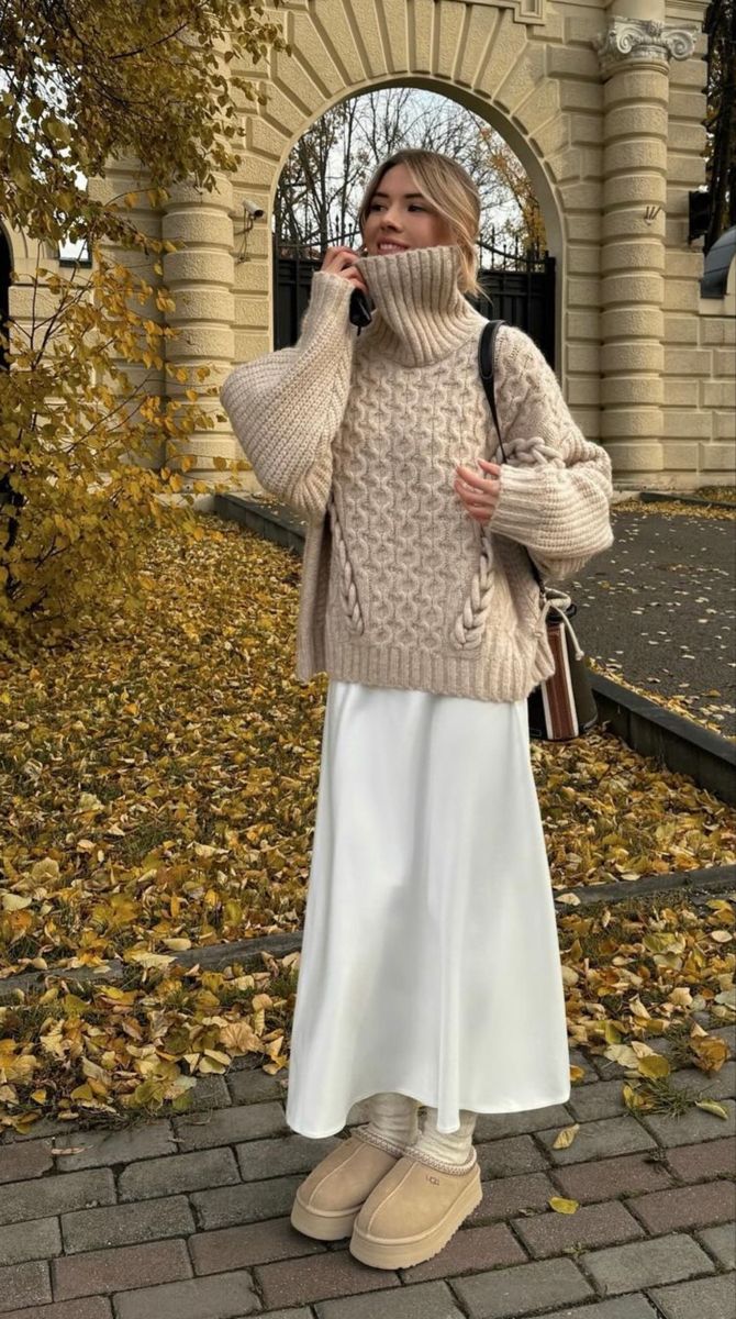 The cream-to-beige chunky cable knit sweater paired with a flowing white skirt and platform slippers is the kind of look that turns a chilly morning into a soft, cinematic moment. The exaggerated neck, braided detailing, and oversized sleeves create a sculptural silhouette that works beautifully on taller and medium-height frames—especially anyone who loves a cozy-yet-elevated aesthetic. It’s warm, practical, and absolutely ideal for early winter strolls, brunch dates, or even a quiet holiday moment that leans into a muted Christmas palette without being literal.