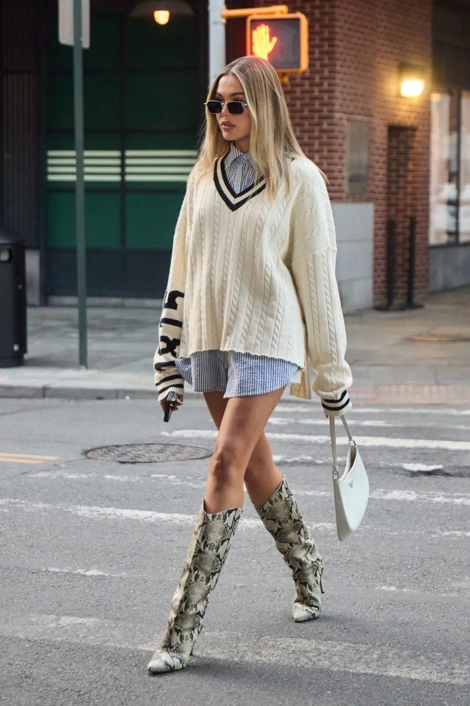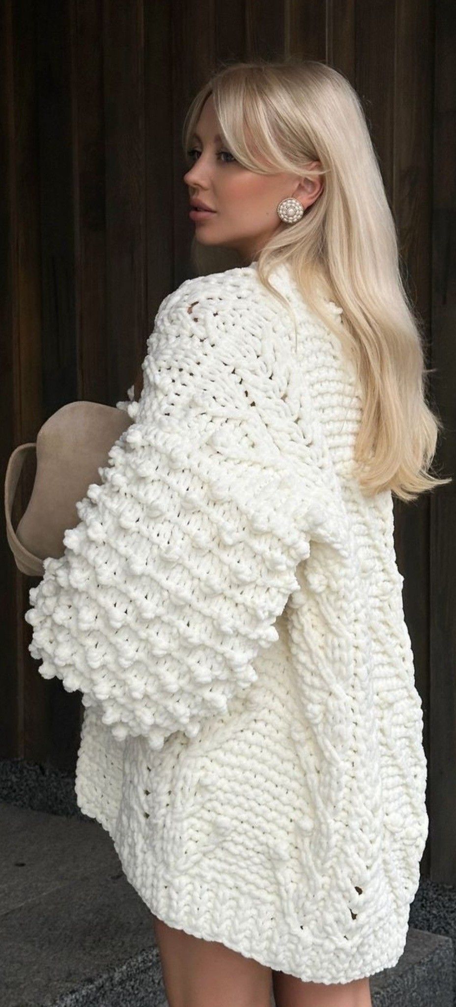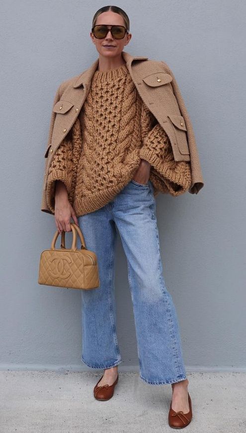 • Neutral accessories: The soft beige bag enhances the creaminess of the knit.