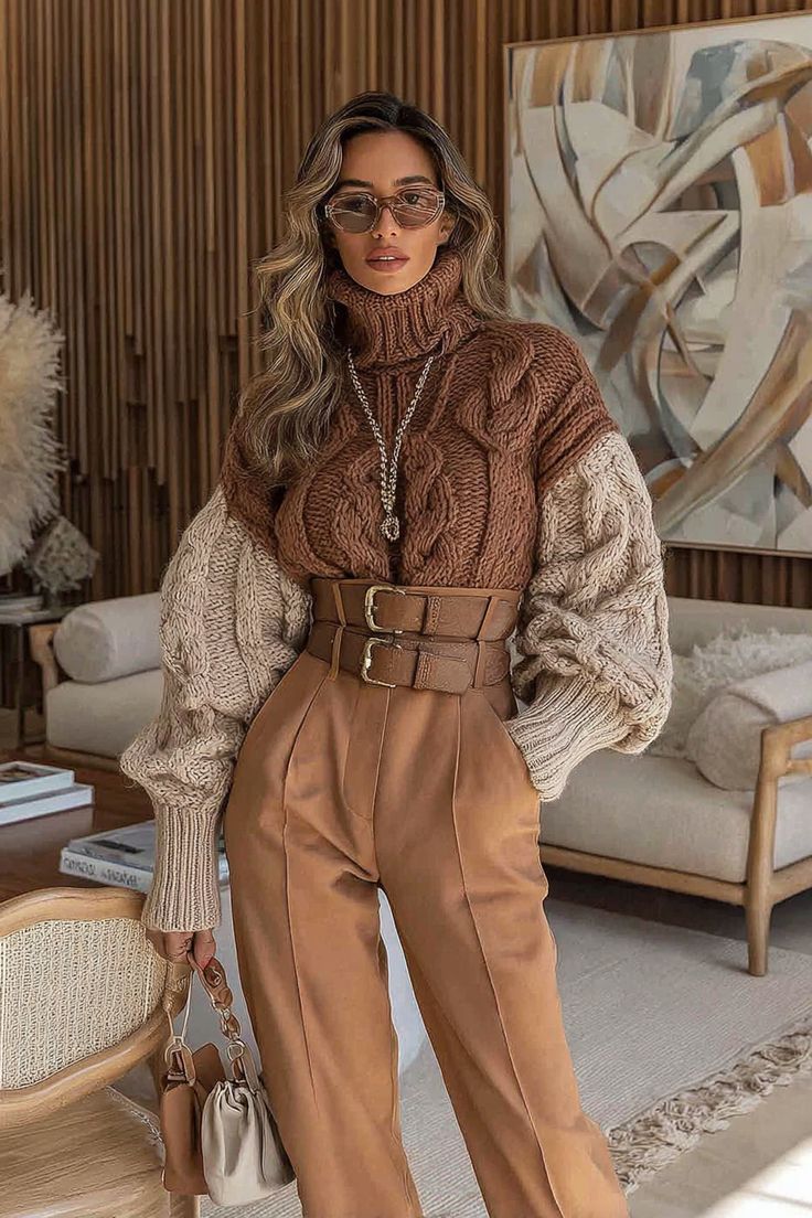 The warm beige turtleneck here is a masterclass in quiet luxury. Thick, plush, and sculpted with cable knit and ribbing, it creates an architectural silhouette that flatters many body types. Paired with soft cream trousers and dramatic turquoise earrings, it becomes a minimalist look with a bold accent. This is ideal for work lunches, gallery afternoons, or anywhere you want sophistication with an edge.
