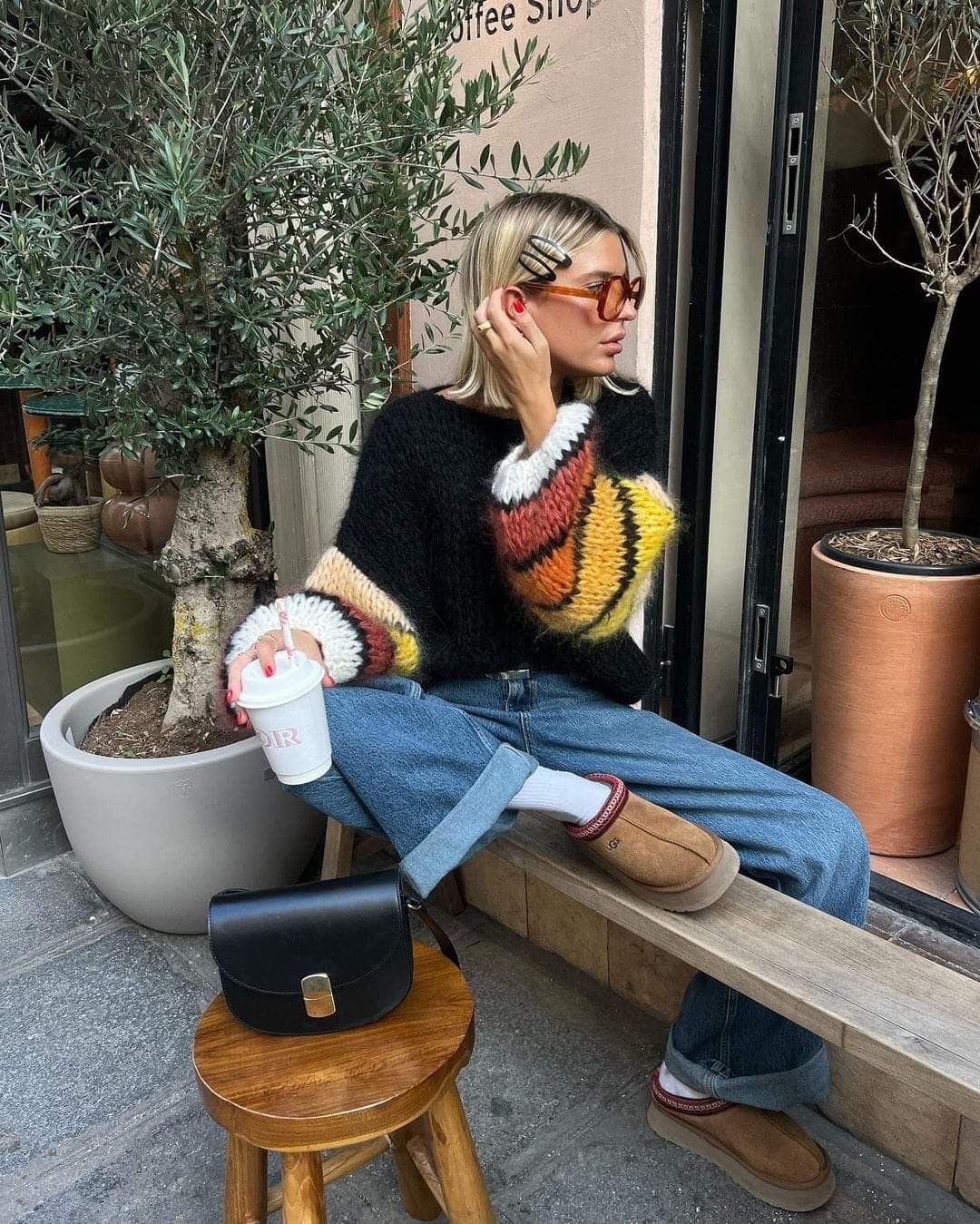 • Yellow oversized cable knit sweater: Bright, cozy, and expressive; the large sleeves add a punch of personality.