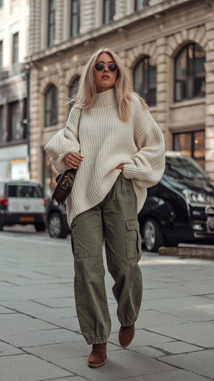 • Cream trousers: Soft and tailored, balancing the sweater’s volume with clean elegance.
