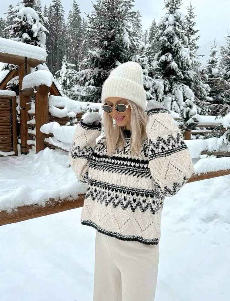 The classic winter palette—white and black with a hint of grey—feels fresh again when it’s wrapped in this thick, Nordic-inspired knit sweater. The oversized shape and geometric patterning make it incredibly practical for real cold weather, not just “fashion cold.” This look suits most body types thanks to its relaxed cut and vertical visual rhythm, making it ideal for snow-covered mornings, ski-town cafés, or festive Christmas getaways where warmth and style need equal billing.