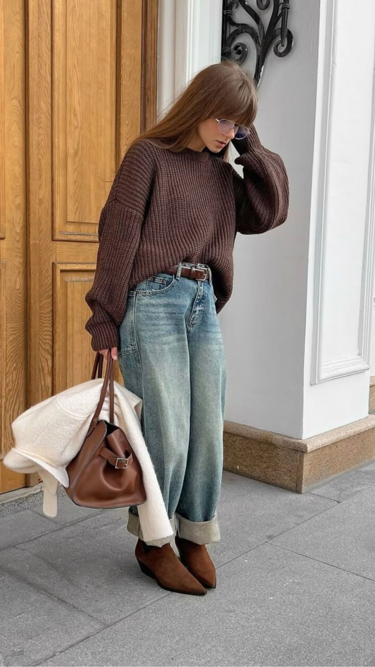 • Gray-brown oversized sweater: A chunky, textural piece that flatters with volume while maintaining a calm, earthy palette.