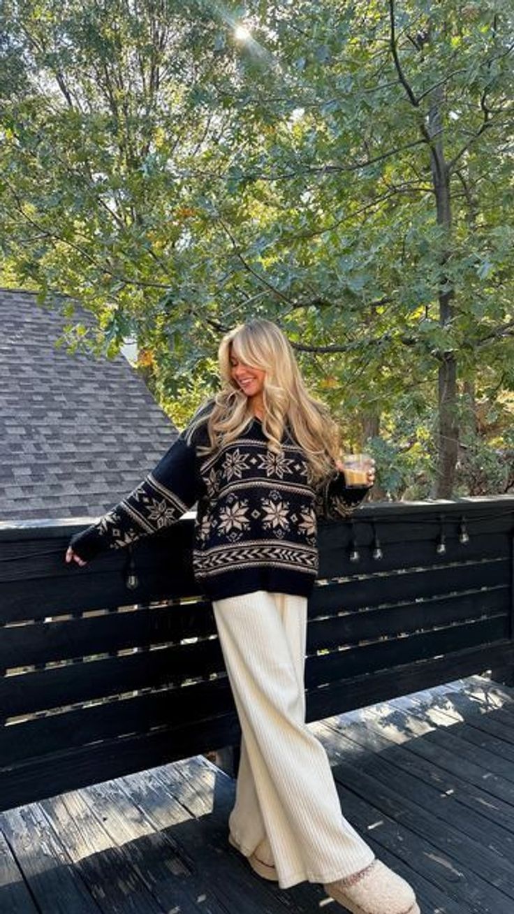 The subtle contrast of a deep black sweater adorned with Scandinavian-inspired cream patterning instantly creates a statement while remaining approachable and warm. Paired with wide-leg beige ribbed trousers, the silhouette feels relaxed yet visually balanced. This outfit works well for most figures, but especially those who enjoy an elongated lower half through soft vertical lines. It’s perfect for early-fall mornings, relaxed mountain trips, or cozy afternoons spent sipping something warm outdoors.