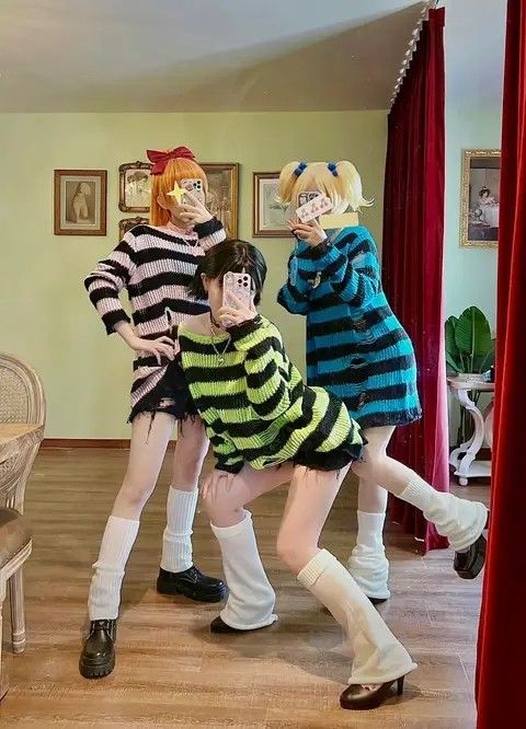 Equal parts snuggly and standout, this striped sweater trio transforms oversized knits into clever cartoon references. Chunky, colorful sweaters are paired with dramatic white leg warmers and dark loafers — a brilliant mix of texture and proportion. These outfits work best on straighter or petite frames due to the oversized top-and-mini bottom combo. Ideal for home parties, group photos, or chill Halloween hangouts.
