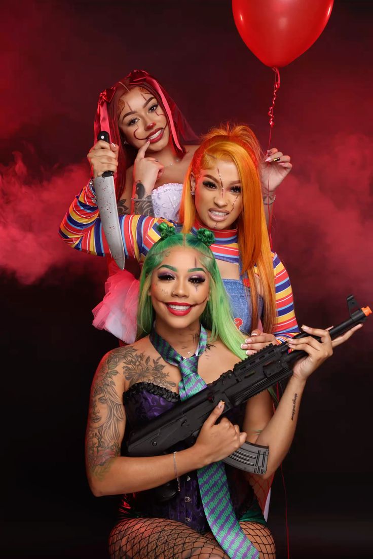 This trio is unapologetically savage, merging iconic horror doll aesthetics with high-octane glam. From pigtails soaked in blood-red streaks to fishnets, tattoos, and a plastic weapon or two, every detail leans into villain couture. These outfits work best for confident curves and statement personalities — they’re less about comfort and more about commanding a room. Ideal for after-dark Halloween events or horror-themed costume contests.