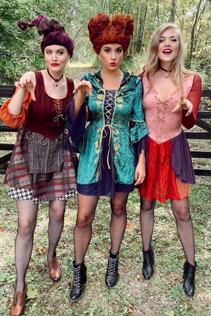 This all-black witch trio doesn’t need color to steal attention. It’s equal parts gothic glamour and minimalist magic. From lace gloves to wide-brim hats, the silhouettes are sleek, sultry, and just intimidating enough. These outfits are super versatile and work on nearly any body type thanks to the forgiving fabric and flattering lines. Best worn to outdoor festivities or spooky soirées under the moonlight.