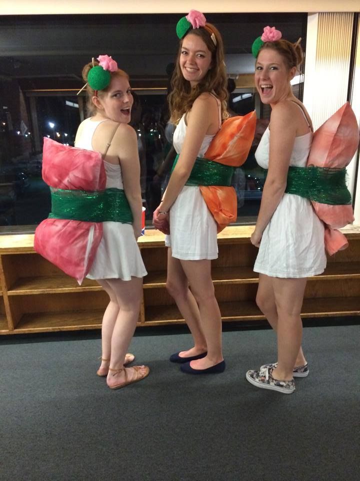 Base: All three wear white tank dresses, which serve as the rice. Add foam toppings in red and orange to mimic fish, and green belts to represent seaweed.