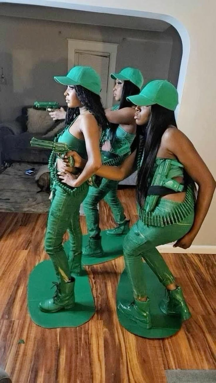This all-green trio takes Halloween into cosplay territory—in the best way. Styled after plastic army men toys, every detail is painstakingly coordinated, from the footwear to the “molded” accessories. This look is more about commitment than comfort, and it’s most flattering on athletic builds that can hold the angular structure. Not ideal for dancing, but 10/10 for dramatic entrances.