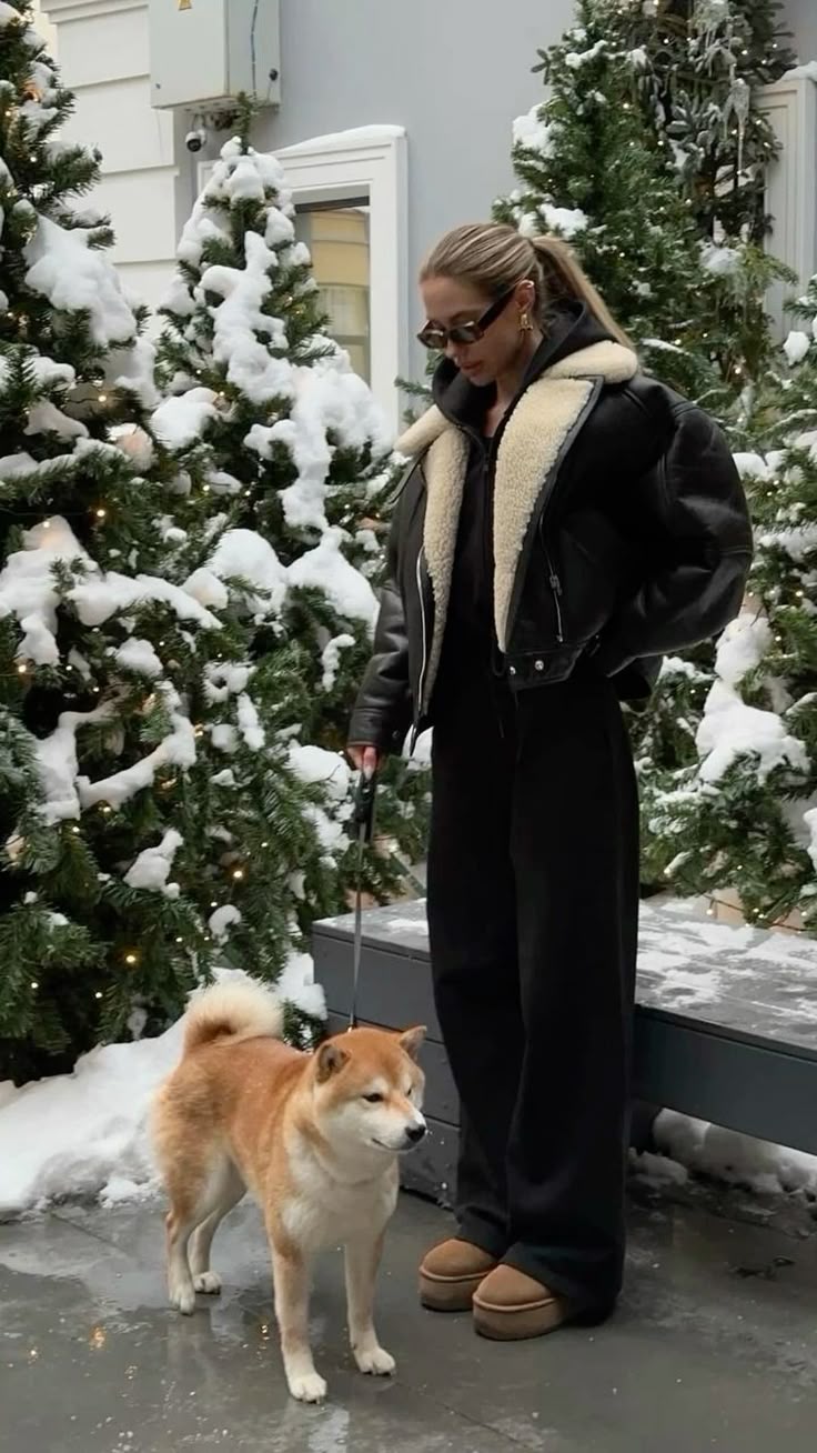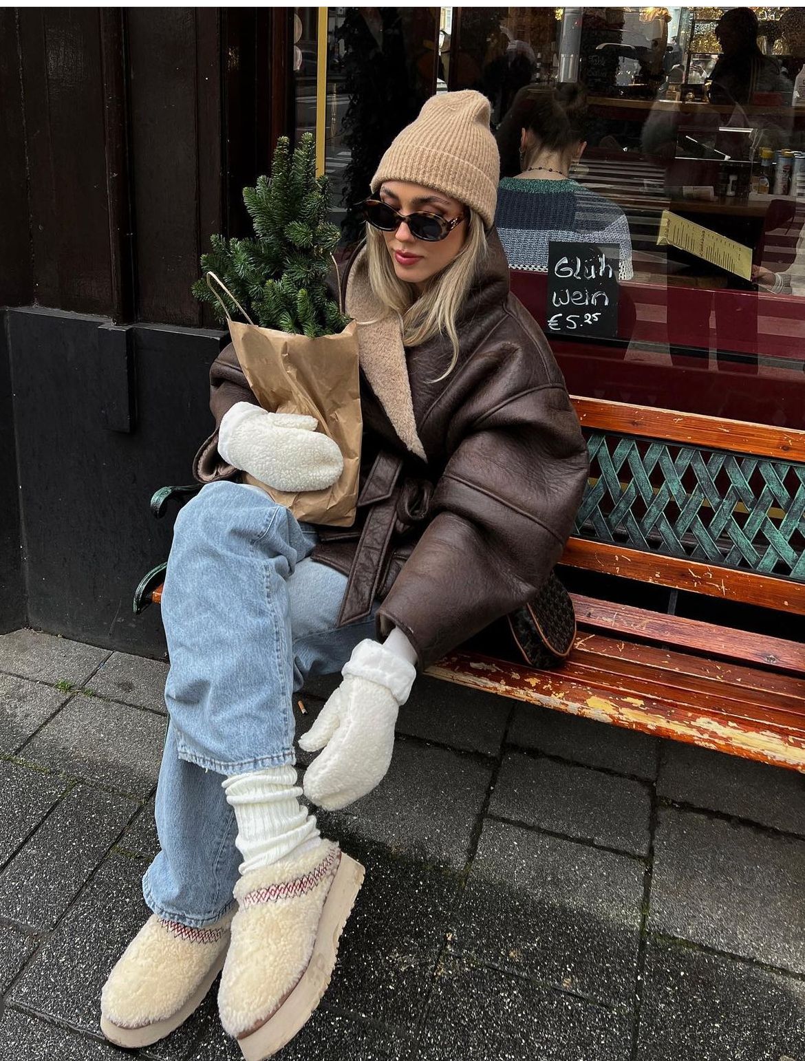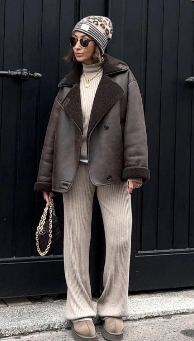 Here’s proof that Uggs play beautifully with knitted textures. A beige ribbed knit set paired with a brown shearling jacket and matching Uggs makes for a chic winter casual uniform. It’s incredibly practical, offering both comfort and polish, perfect for travel or café lounging.