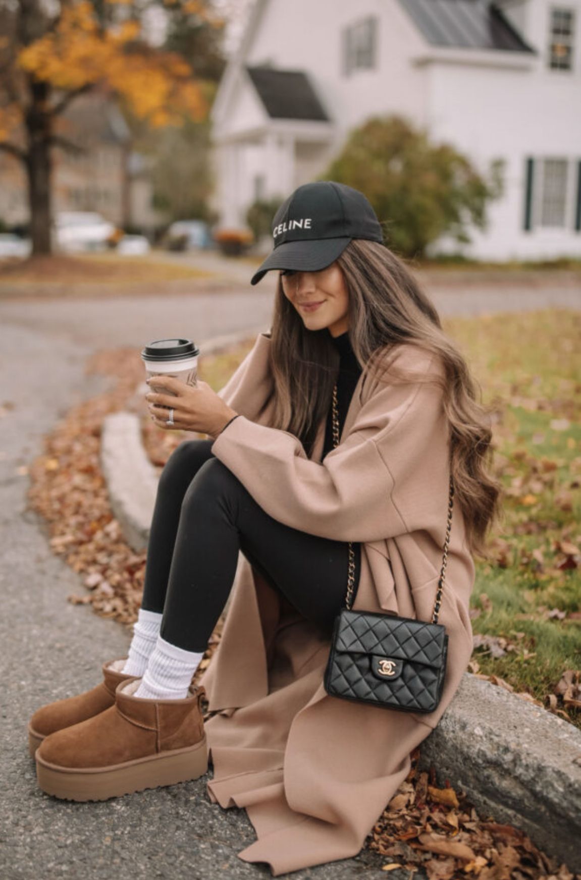 This pairing of camel coat, black leggings, and brown platform Uggs hits the sweet spot of chic comfort. It’s universally flattering—leggings streamline the body while the long coat elongates the figure. Best for weekend strolls or casual brunch, but less fitting for formal spaces.