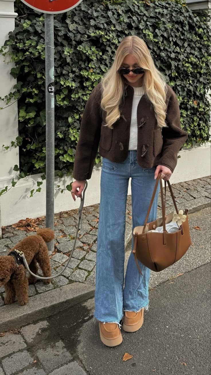This look channels casual charm with a brown teddy jacket, light blue jeans, and camel Uggs. The earthy mix flatters most figures and is perfect for winter errands or coffee strolls.